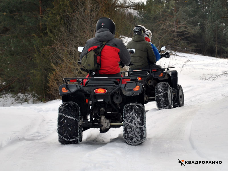 Зимой, при езде по снегу, проходимость заднеприводной техники выше при дополнительной нагрузке на заднюю ось - поэтому рекомендуется ехать экипажем (2 человека на квадроцикле (багги).